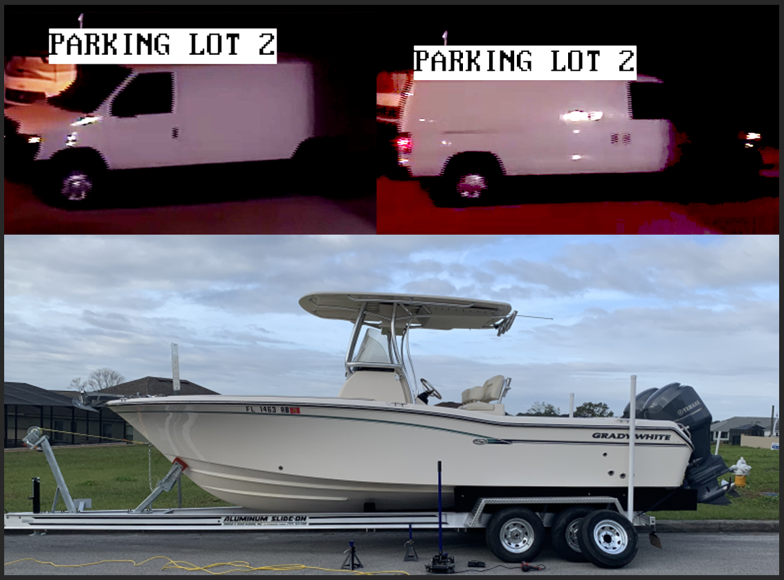 Anyone who has any information which might be helpful to this investigation is asked to call Detective Walsh at 863-499-2400, or to remain anonymous, contact Heartland Crime Stoppers - call 1-800-226 TIPS (8477), visit www.heartlandcrimestoppers.com and click on "Submit A Tip," or download the free "P3tips" app on your smartphone or tablet.stolen boat and suspect vehicle